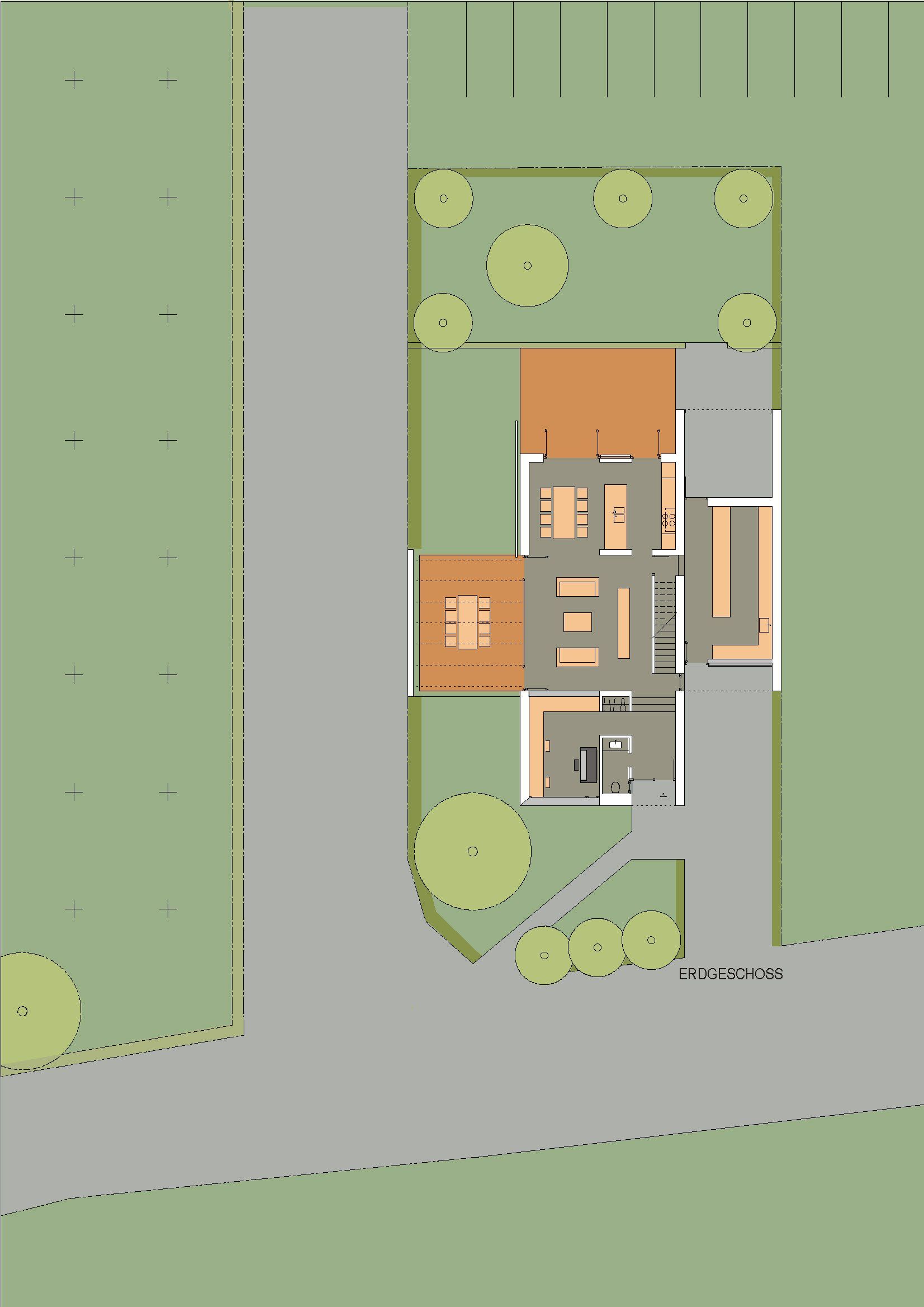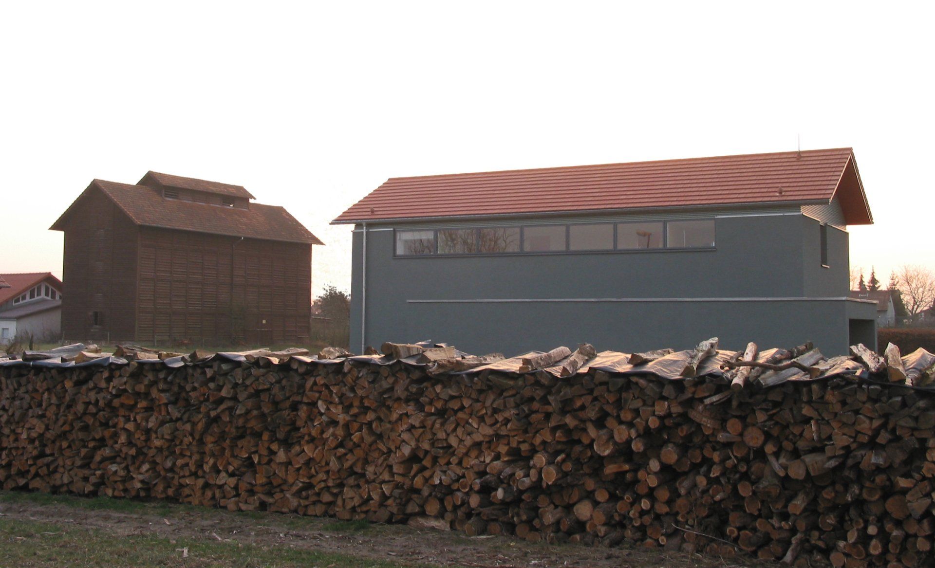 Auf einem schmalen Grundstück von 539 qm entstand ein zweigeschossiges Wohnhaus mit Kellerersatzraum von 189 qm Wohn- und Nutzfläche. Das Haus orientiert sich an der archetypischen Formensprache der gegenüberliegenden Tabakscheune. Die Grundfläche des Wohnhauses beträgt 7,00 * 15,00m. Beheizt wird das Haus über Erdkollektoren mit einer Wärmepumpe.