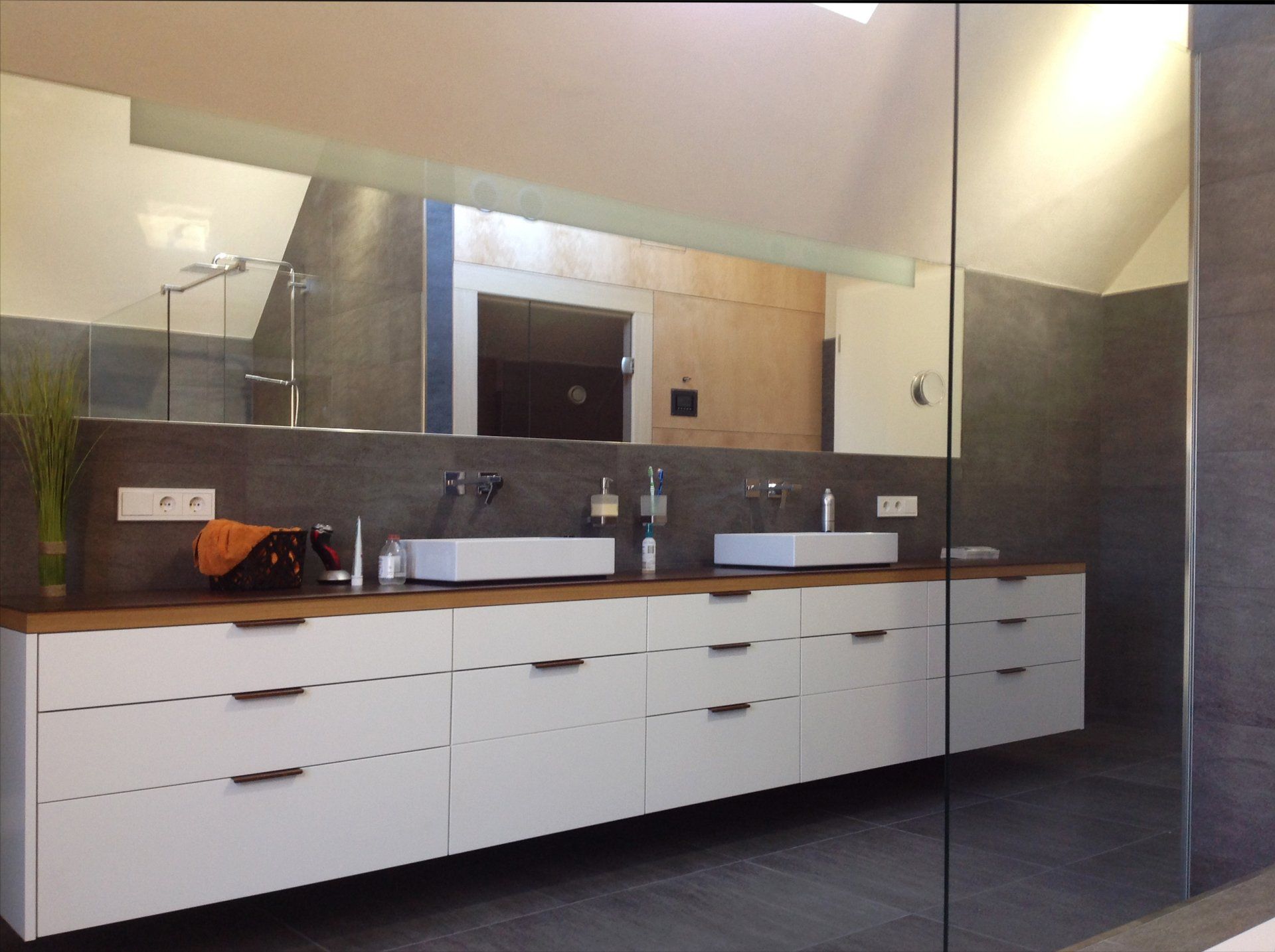 Im Dachgeschoss, abgeteilt durch eine halbhohe Schrankwand zum Luftraum, liegt der offene Schlafbereich mit abgeschlossenem großem Bad.