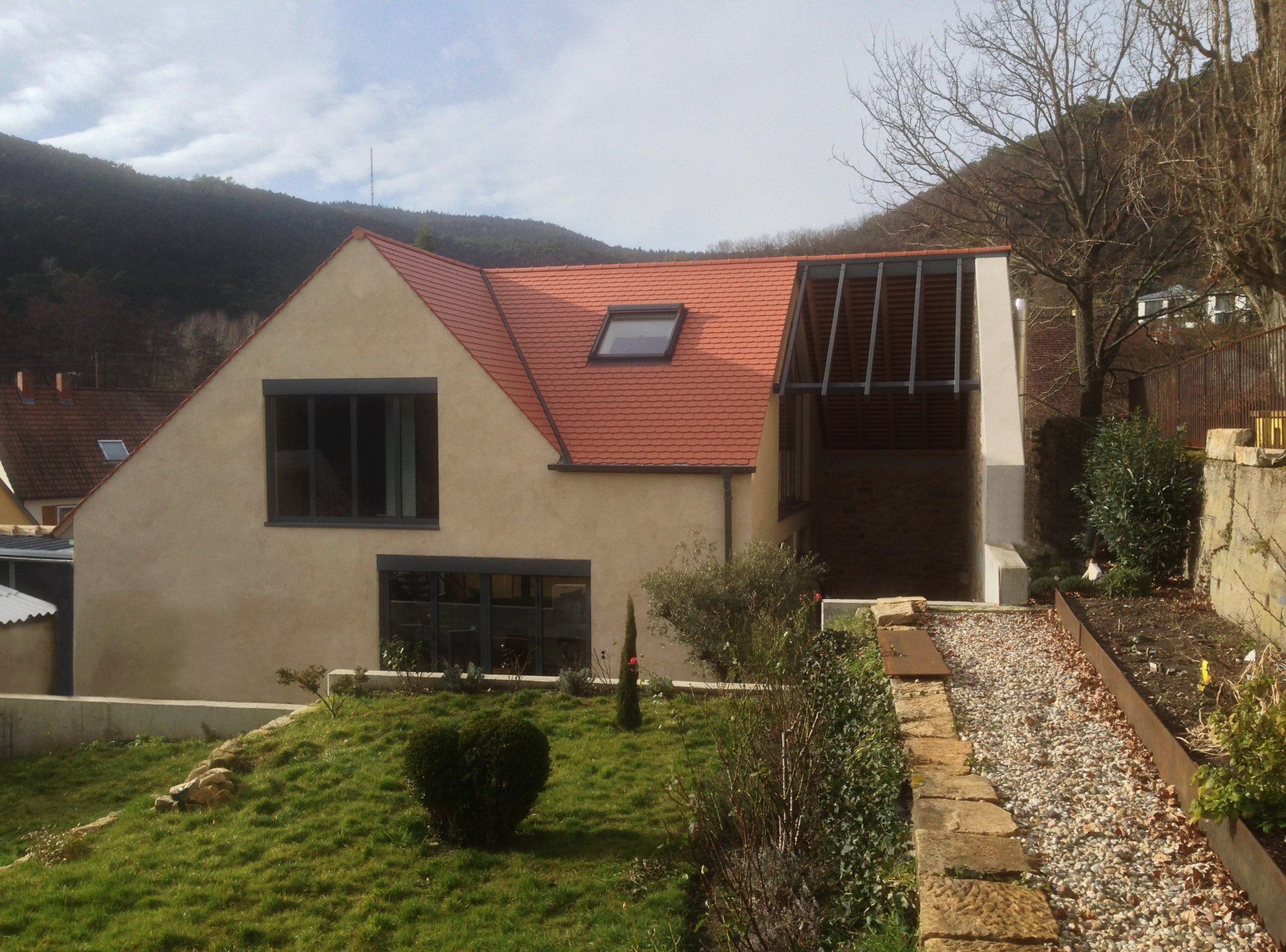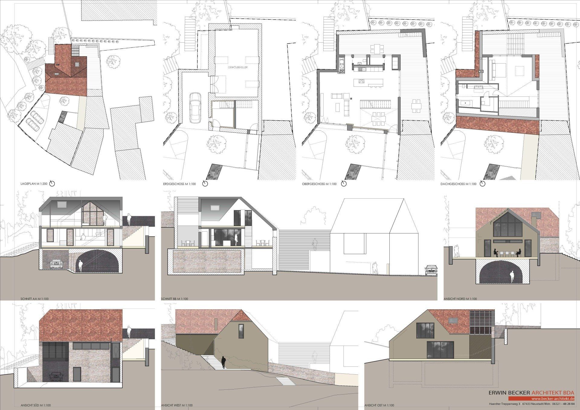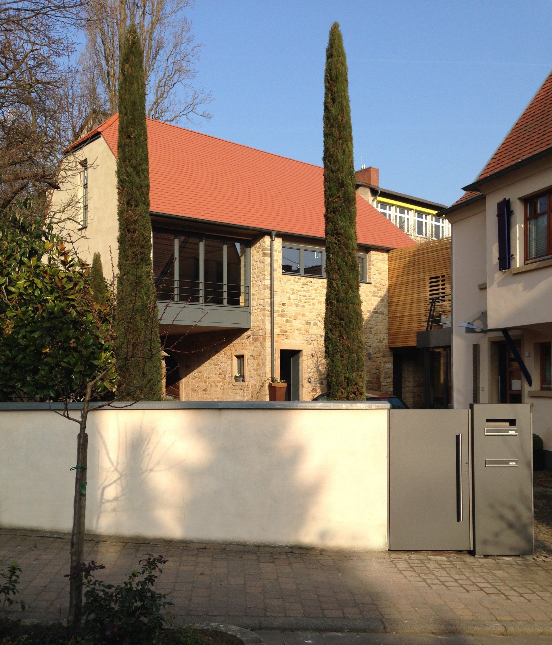 Die vorhandene Scheune mit Kellergewölbe und einer Remise ist hangseitg eingegraben. Die vor dem Kellergewölbe liegenden Vorräume zum Innenhof werden für den Eingang und die Technik genutzt. Die vorhandene Geometrie des Gebäudes wurde detailliert vermessen und anschließend das Dach und ein Teil der Umfassungswände abgetragen und neu wieder aufgebaut.