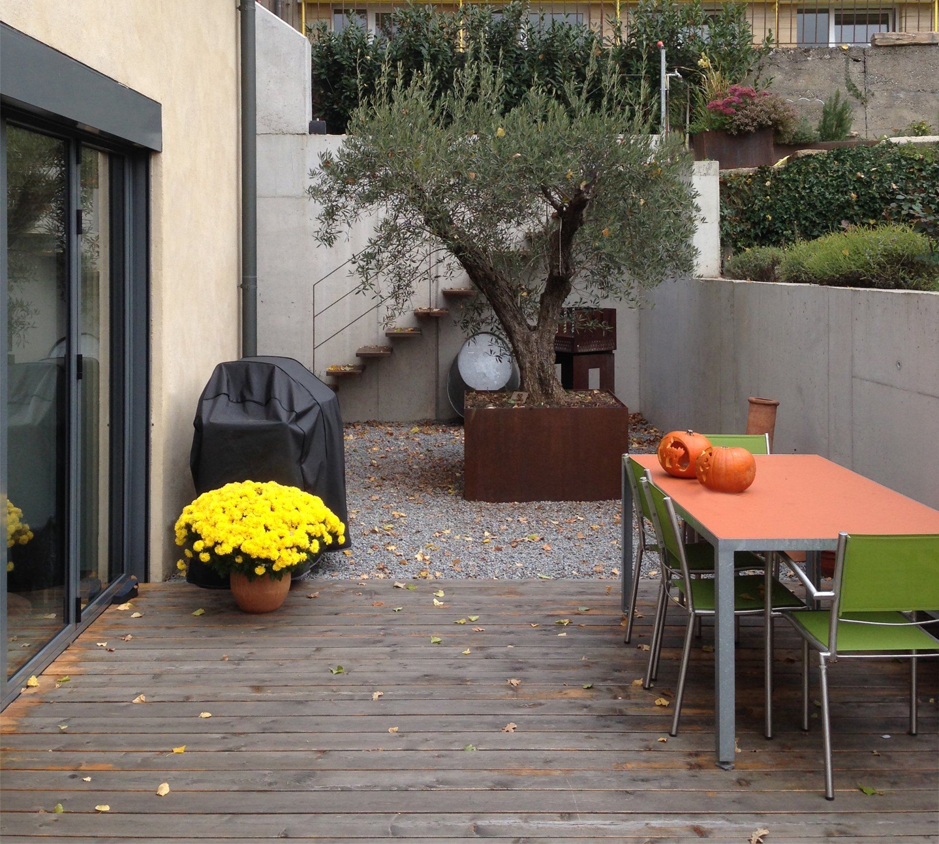 Im Obergeschoss befinden sich ein offener Küchen-, Ess- und Wohnbereich mit Ausgang zu den oberen Terrassen.