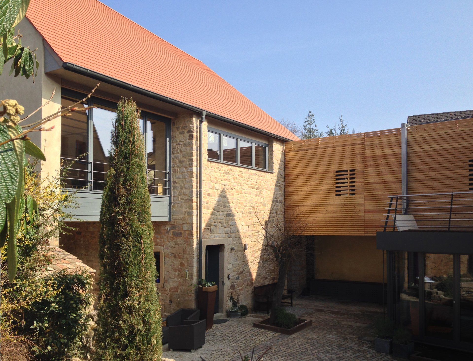 Vorhaus und Wohnscheune sind über eine Stahl-Holz-Brücke miteinander verbunden.