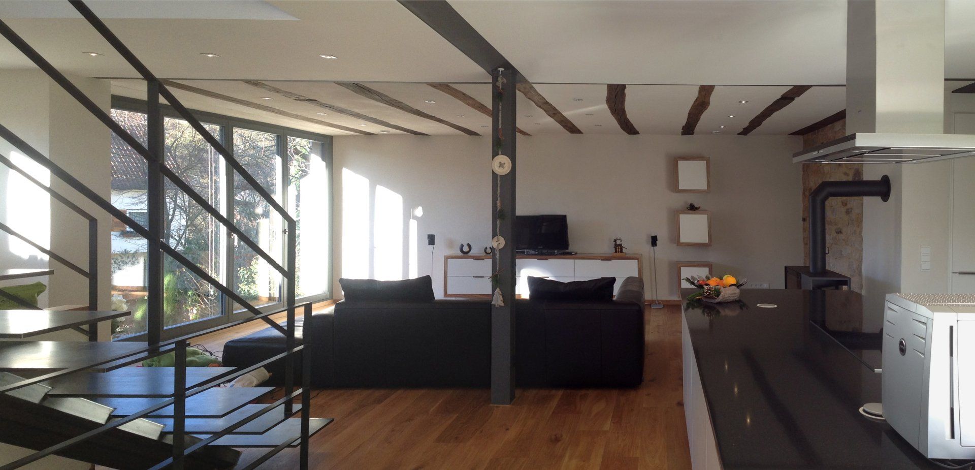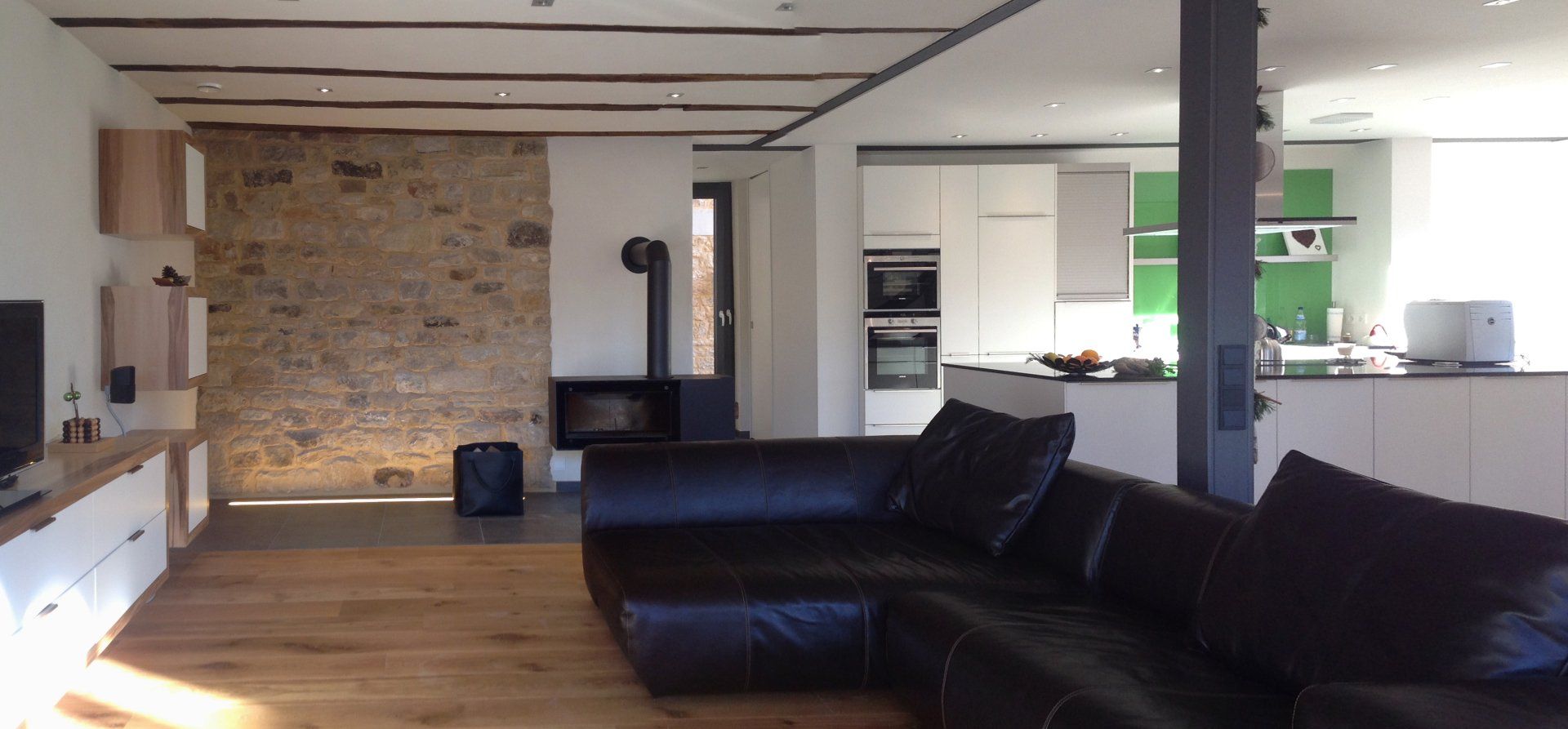Im Wohnbereich sind vorhandene alte Deckenbalken wieder aufgearbeitet und sichtbar eingefügt worden.