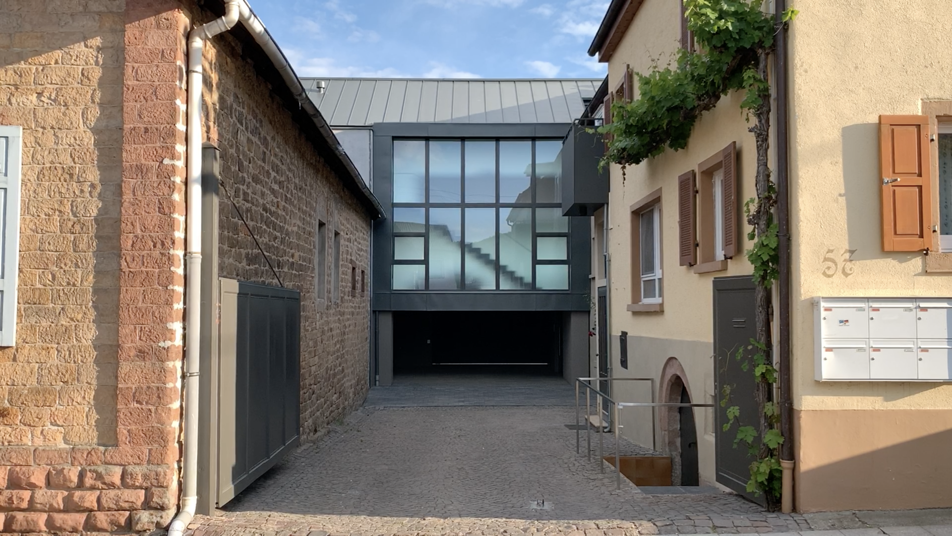 großen Weinkeller der neue Baukörper. Über dem Sockelgeschoss als Eingang